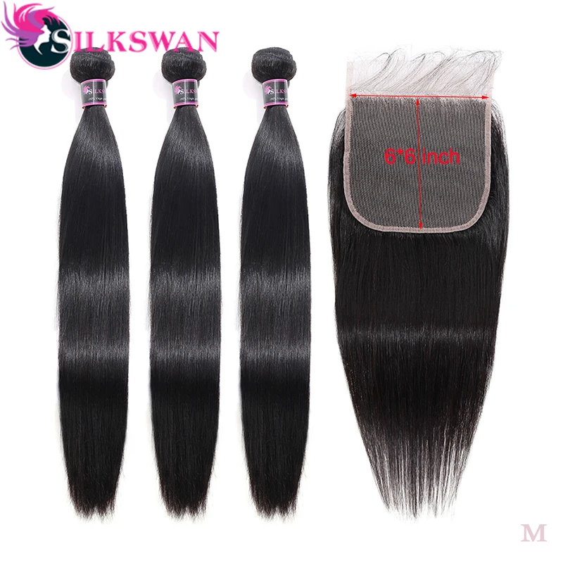 Silkswan Human Hair Straight 3Bundles With 6x6 Lace Closure Brazilian Remy Hair 10-40 Inch Hair Wea